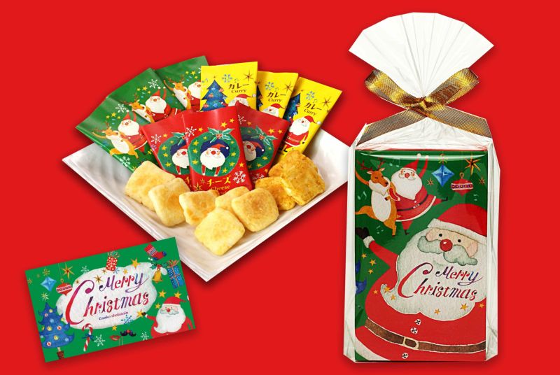 クリスマスの可愛いパッケージデザインの箱に入った、柔らかく食べやすいお煎餅3種(チーズ、サラダ、カレー)の詰合せです。