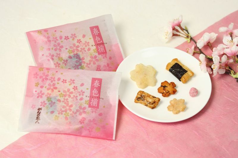 春を感じるデザインの小袋には6種のあられ・お煎餅が入っています。