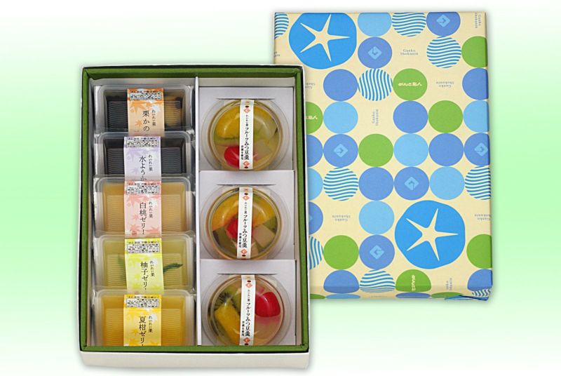 「栗かのこ 1個・あっさり水ようかん 1個・白桃ゼリー 1個・柚子ゼリー 1個・夏柑ゼリー 1個・