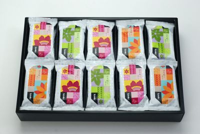かわいらしく個性の光る美味しいあられ・お煎餅を「花」「水」「緑」3種の小袋に詰合せた人気商品です。