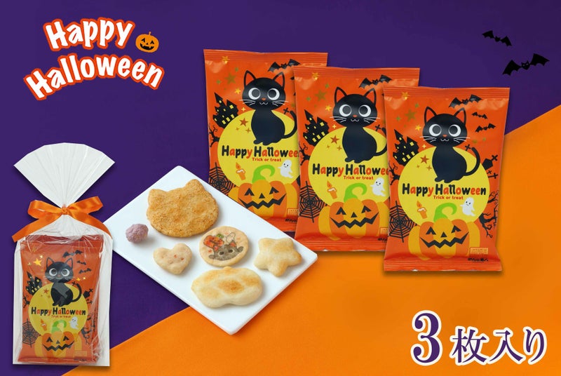 猫やかぼちゃ、星など、ハロウィン気分を味わえる、6種の可愛い米菓詰合せを、3袋まとめてラッピングしました。(ハロウィン専用のビニール袋付きです。)