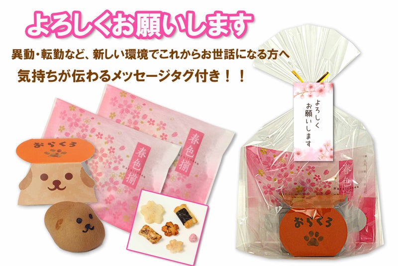 【オンライン限定ラッピング】 「よろしくお願いします お菓子」(おかき 春色揃×2袋 + おらくろ×1個) 計3個入りセット(ピンク 桜柄タグ)