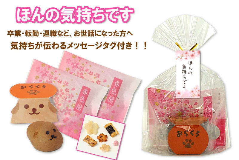 【オンライン限定ラッピング】 「ほんの気持ちです お菓子」(おかき 春色揃×2袋 + おらくろ×1個) 計3個入りセット(ピンク 桜柄タグ)