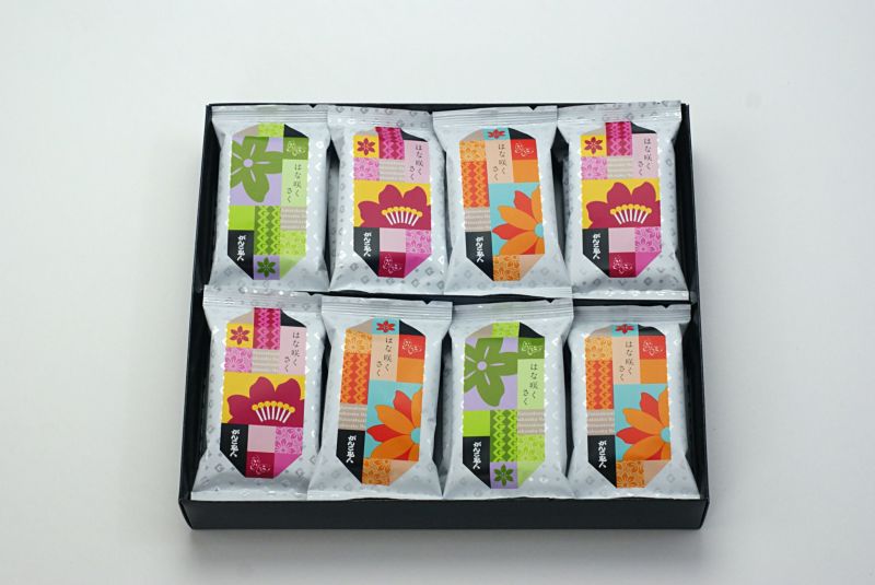 かわいらしく個性の光る美味しいあられ・お煎餅を「花」「水」「緑」3種の小袋に詰合せた人気商品です。