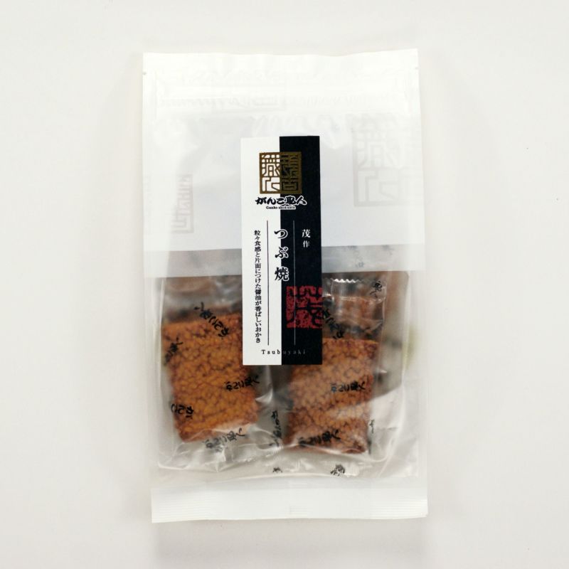 もち米の粒々を残した生地に、職人が独自にブレンドした醤油を片面だけに塗り色よく焼き上げました。(茂作)