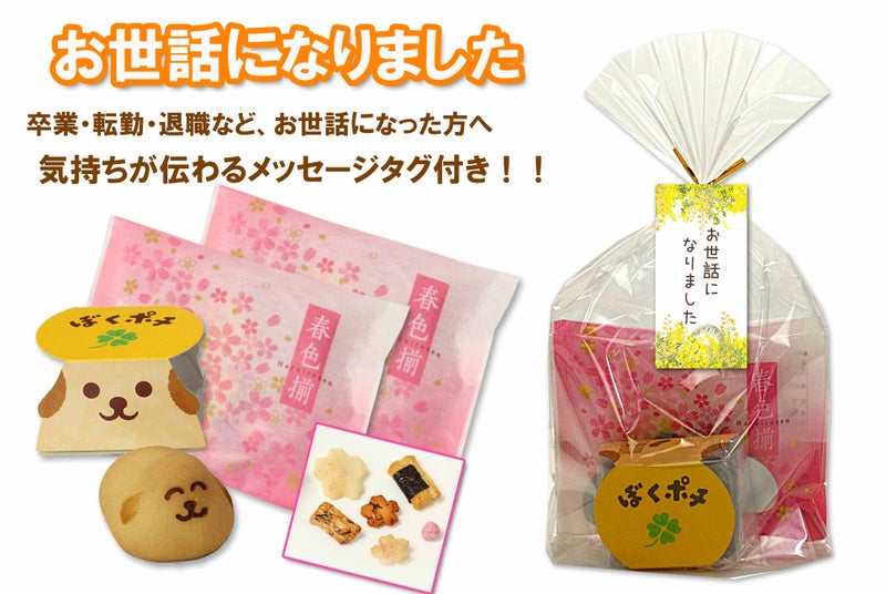 「お世話になりました お菓子」(おかき 春色揃×2袋 + ぼくポチ×1個) 計3個入りセット(黄色 ミモザ・菜の花柄タグ)