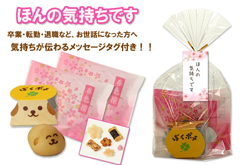 【オンライン限定ラッピング】 「ほんの気持ちです お菓子」(おかき 春色揃×2袋 + ぼくポチ×1個) 計3個入りセット(ピンク 桜柄タグ)