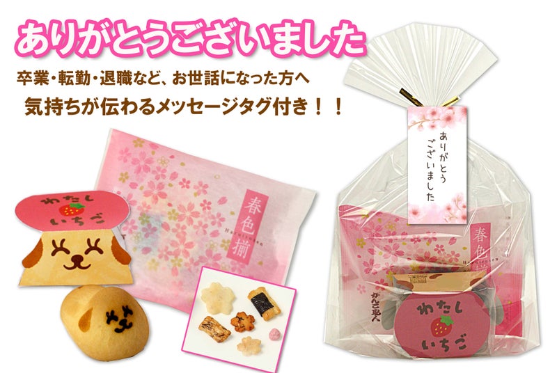 「ありがとうございました お菓子」(おかき 春色揃 + わたしいちご) 2個入りセット(ピンク 桜柄タグ)