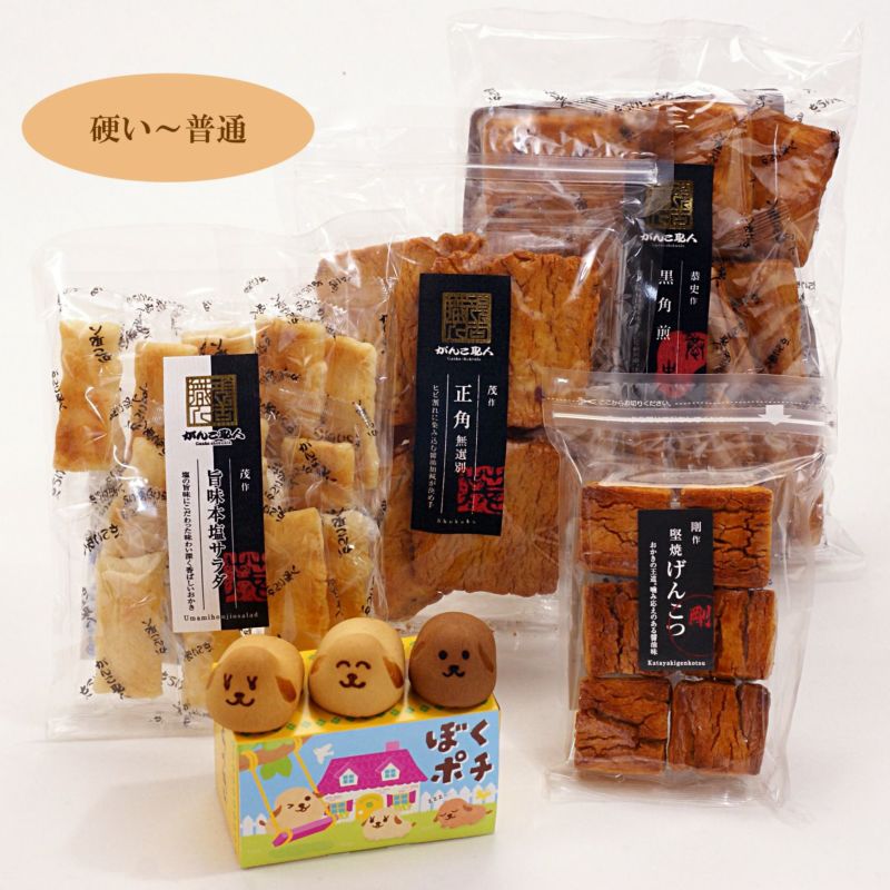 がんこ職人の「硬め~普通」の硬さのおかきと「ぼくポチシリーズ」がお得にお試しできるセットです。