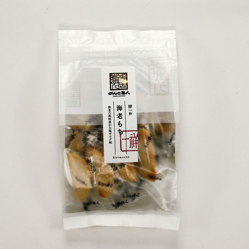 海老を練り込み、さっくりとした食感に焼き上げた、塩サラダ味のおかきです。(祥一作)