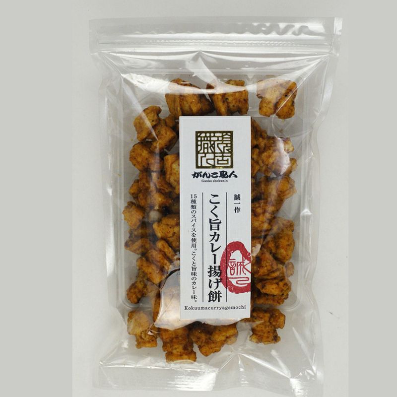 職人独自にブレンドしたカレーたれを、揚げ餅にたっぷりと絡めた、コクと旨味引き立つしっとり食感のおかきです。(誠一 作)